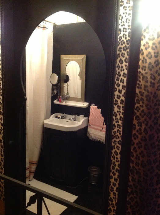 Au fond, derrière une porte Orientale, se cache la petite salle de bain avec sa douche à l'italienne. Une Gravure d'Antinoé... De ses trois fenêtres, Mayia surplombe le patio, les feuilles de bananiers et le chant des oiseaux.