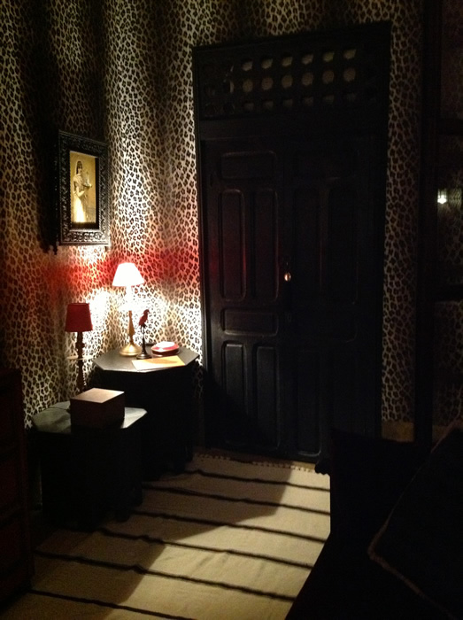 Maya is like a wild, male and brutal dream, coming out of the Egyptian Campaign. Like the room of a General of the Imperial Army the day after the battle of Aboukir. Everything is here in pure Directoire style with Orientalist points: a large black metal canopy bed inspired by that of Bonaparte in the countryside, an order studded with red leather, the walls upholstered with leopard or red, reminiscent of the saddle pads of Dragons, old engravings of LeBrun, Cairo, Aboukir and the encyclopaedic dictionary.
